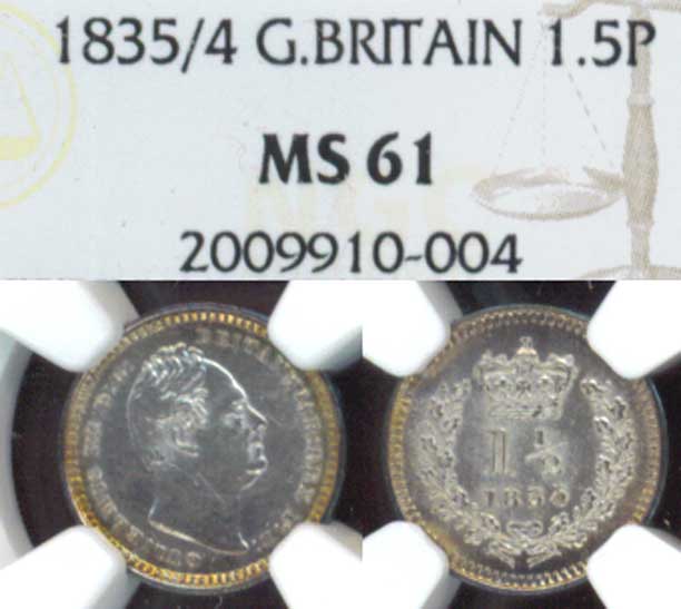 Item Number: GB-137 NGC MS 61 - 1-1/2 Pence Sterling Silver #719 Head of King William IV. Very small silver coin approx. 12 MM. A beautiful Mint State coin with great luster and alot of flash. Plus this is the 1835/4 over date variety$195.00