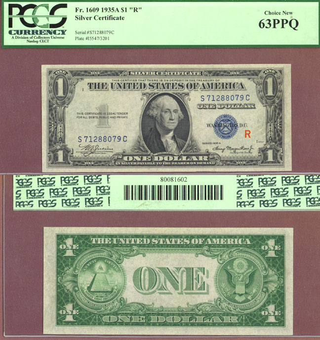 SSC-178 PCGS Choice New 63 PPQ - FR-1609 Julian/Morgenthau - Nice margins on this Choice Uncirculated note! With PPQ "Premium Paper Quality" Seldom encountered "R" Experimental Blue Seal US Silver Certificate. It has been said in the case of experimental notes a red R was overprinted on the regular paper and a S was overprinted on the special paper. But recent information has come up that the "R" really stands for Rayon and these are the experimental notes, while "S" means Silk. During WW 2 a large amount of silk was needed to make parachutes. So it would be likely that this was a wartime experiment to replace the silk threads used in US currency. The notes both R & S were delivered June 20th 1944 and issued into circulation to test there comparable durability. No conclusive results were determined from the experimental issue. Still a neat part of history!