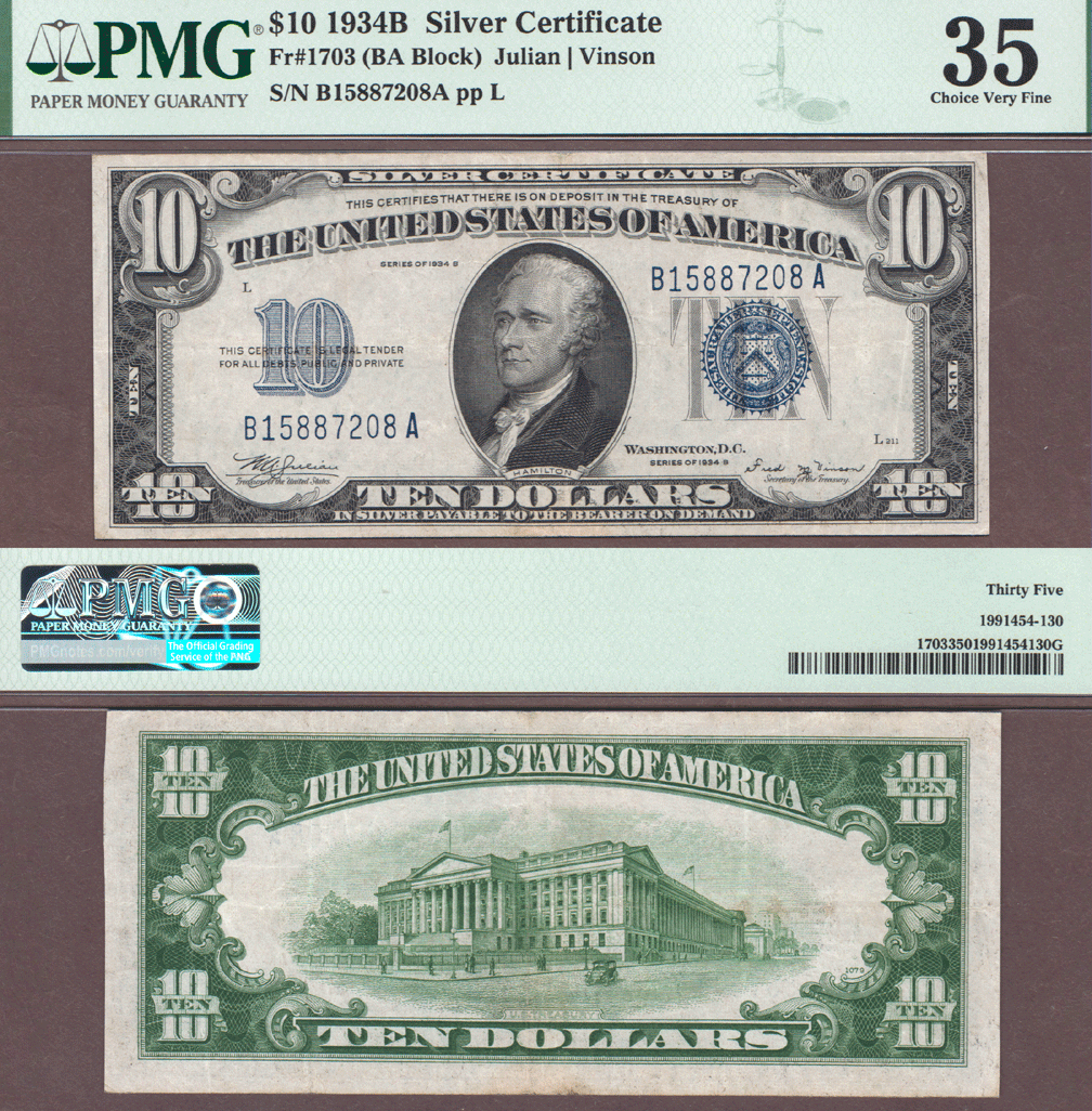 PMG Choice Very Fine 35 EPQ - FR-1703 Julian/Vinson - Clean well margined note. Series 1934-B $10 has the lowest printing of all the $10 Small size silver certificates. Only 337,740 made.