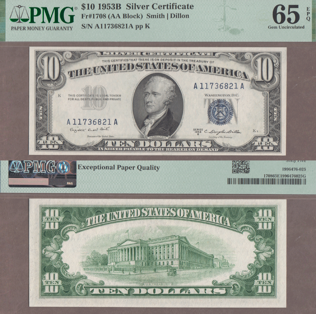 Item Number: SSC-298 PMG GEM Uncirculated 65 EPQ - Smith/Dillon FR-1708 - Beautiful fresh GEM note with "EPQ" Exceptional Paper Quality. Consecutive serial number to the other $10 FR-1708 on the web site. Only 720,000 made.$225.00