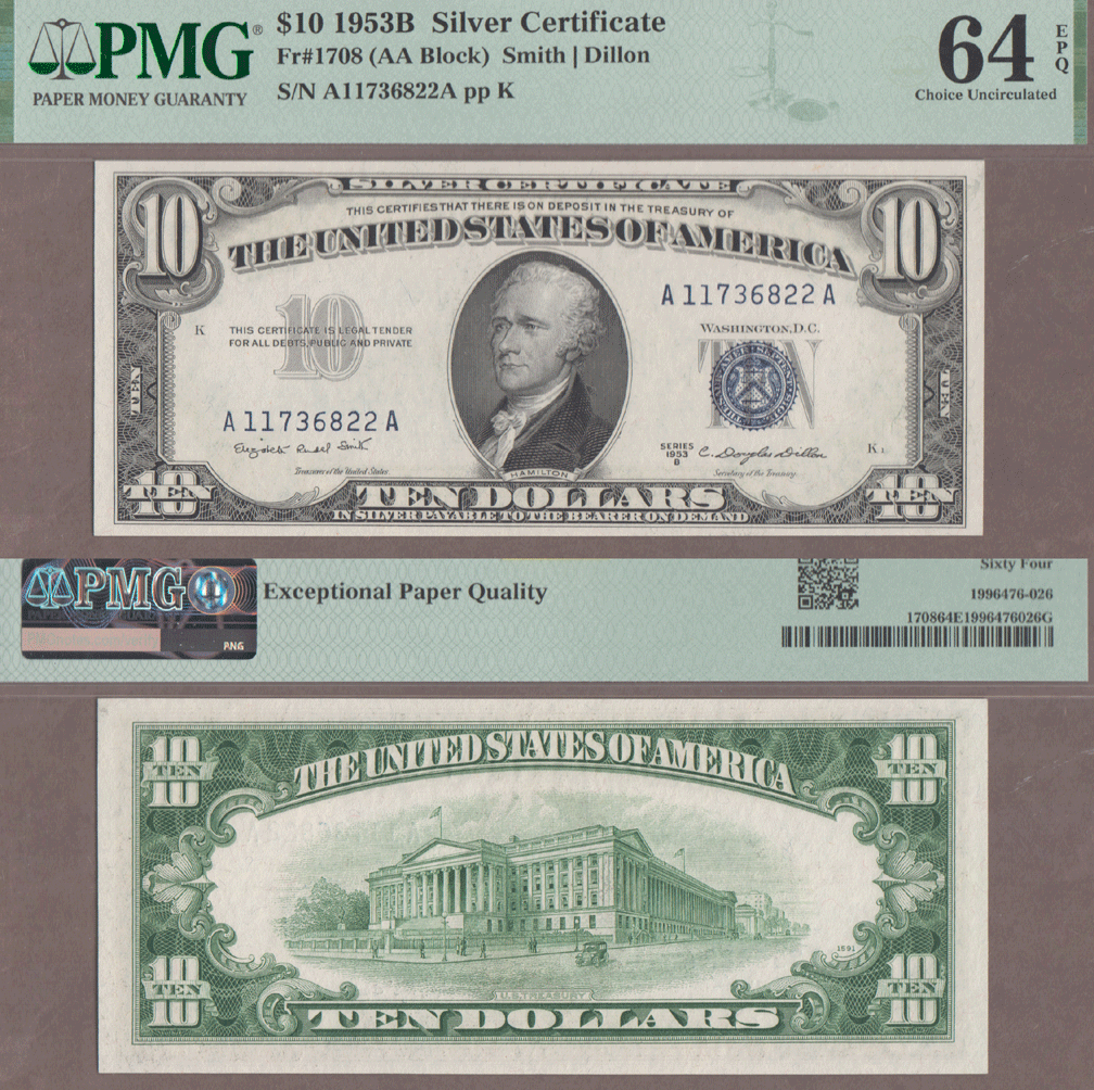 Item Number: SSC-299 PMG Choice Uncirculated 64 EPQ - Smith/Dillon FR-1708 - Beautiful fresh near GEM note with "EPQ" Exceptional Paper Quality. Consecutive serial number to the other $10 FR-1708 on the web site. Only 720,000 made.$175.00