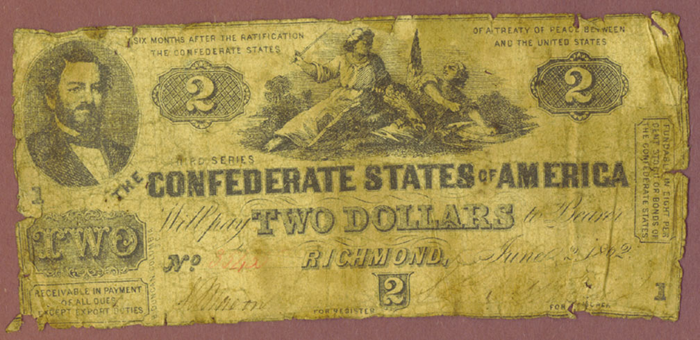 Item Number: CSA-119 Good+ June 2 1862 Third Series - Small size 6-1/4" X 2-3/4" Uniface note. A little rough on the edges. Shows South striking down the Union at upper center. Judah P. Benjamin at upper left. He was the Secretary of War for the Confederate States. $30.00