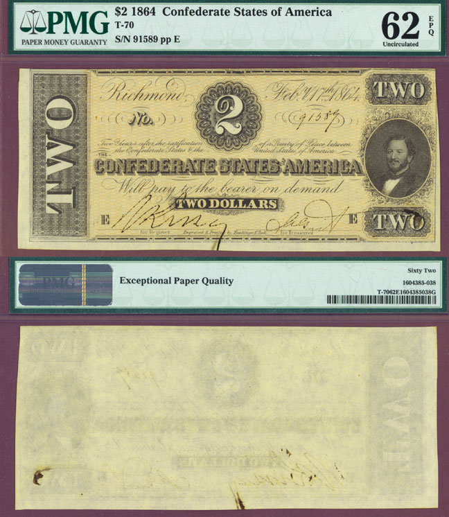 Item Number: CSA-120 PMG Uncirculated 62 EPQ - T-70 Feb. 17 1864 - Serial number 91589 - E - Great uncirculated note with "Exceptional Paper Quality". Portrait of Judah Benjamin Secretary of War for the Confederate States at right.$150.00