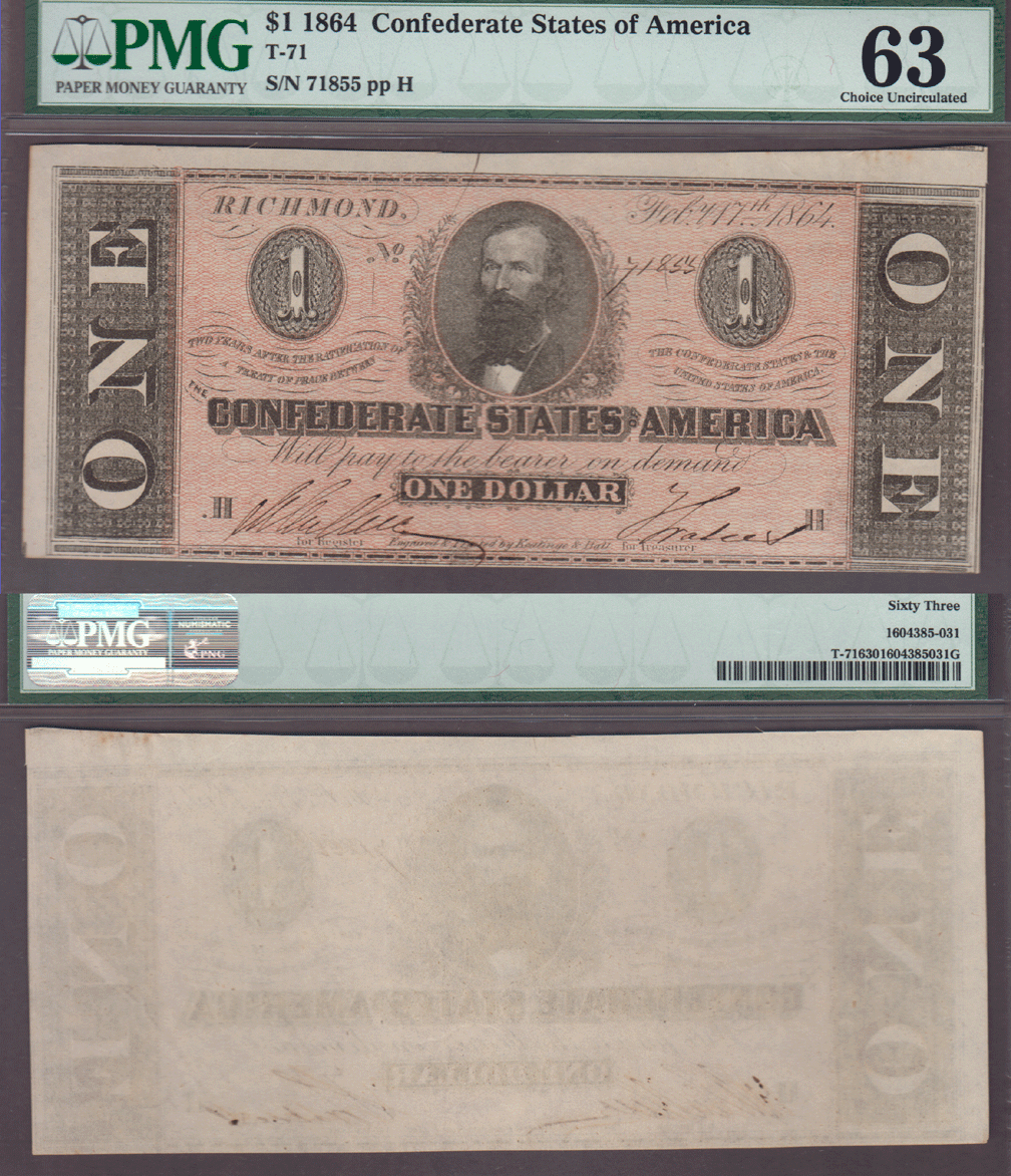 T-71 $1 1864 Confederate currency PMG CU 63 r