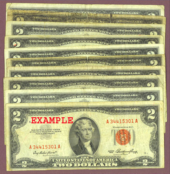 Item Number: SPEC-24E 10 Average Circulated $2.00 US Notes w/ RED Seal - There will be 1953 & 1963 series notes. They will be well circulated but complete without any missing corners. Limited supply at this price.$60.00