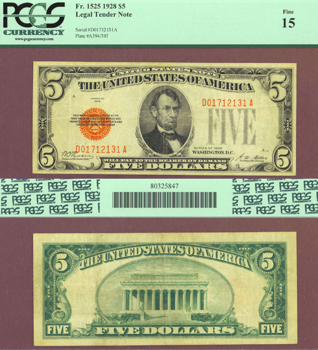 Item Number: SLTN-115 PCGS Fine 15 - FR-1525 Woods/Mellon - This 1928 $5.00 Legal Tender is from the RARE D-A Block as noted in the Schwartz-Linguist reference. Very small % of notes from the D-A Block. Original no problem note. $295.00