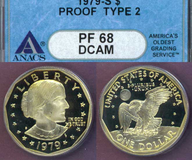 Item Number: SBA-44-CC ANACS Proof-68 Deep Cameo Type 2 - CLEAR "S" Key Date High grade Black and White Cameo beauty. Mintage of 3,677,175 for both varieties$45.00