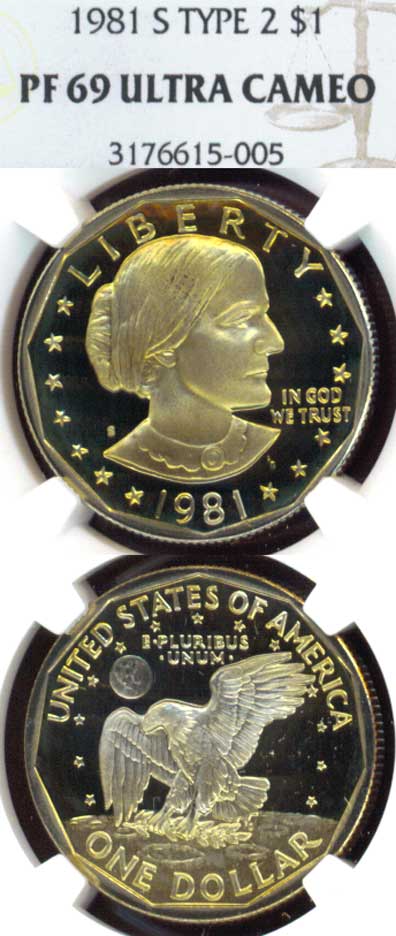 Item Number: SBA-43-CC NGC-Proof-69 Ultra Cameo Type 2 - Beautiful Deep Cameo on this super high grade Type II SBA Dollar. Hard to find and the KEY coin to the SBA series. Mintage unknown.$120.00
