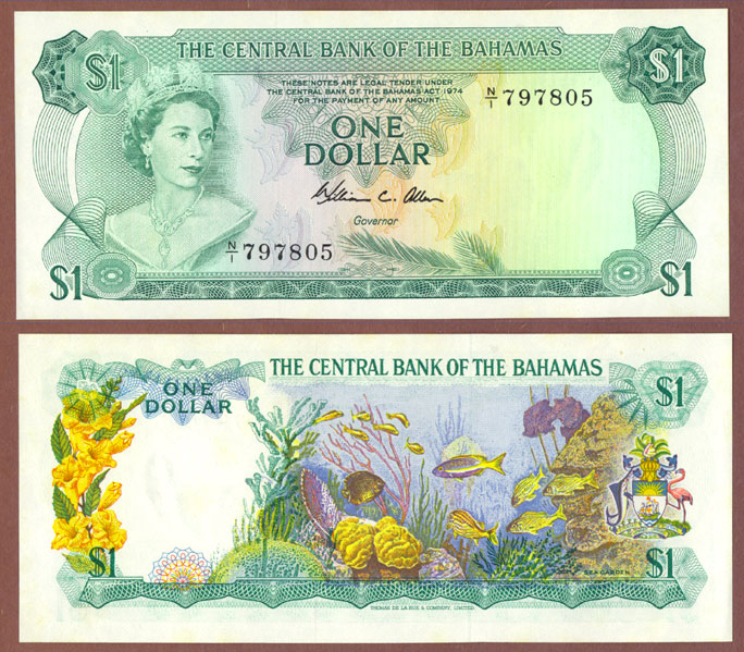 Item Number: B-32 Choice About Uncirculated - #35B Allen signature - Front is Dark blue green on multicolored underprint with portrait of Queen Elizabeth II on the left. Back has colorful sea garden with Coat of Arms on right and shellfish watermark on left.$30.00