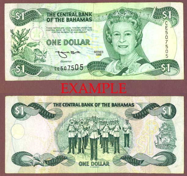 Item Number: B-31E Fine or Better - #57 Front is deep green on multicolored underprint with portrait of Queen Elizabeth II center right, map at center left and fish at left. Back: Royal Bahamas Police Band at center. Watermark: Caravel sailing ship.$5.00