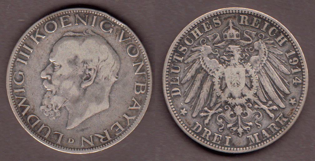 Item Number: GER-151 Fine+ 3 Mark .900 Silver #1005 Munich Mint Ludwig III Original uncleaned 3 mark.$60.00