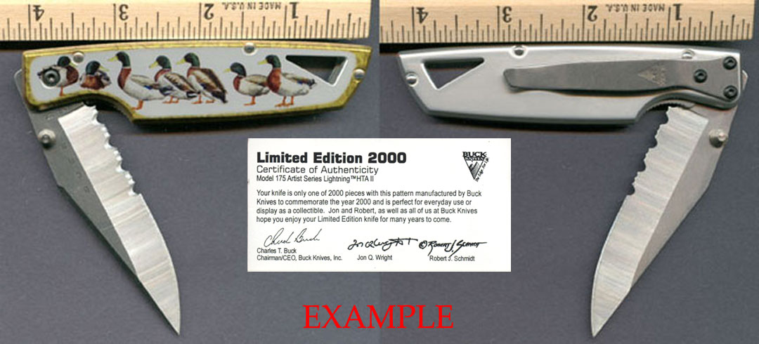 BU-24E MADE IN THE USA. This knife is one of only 2000 made with this pattern by Buck Knives to commemorate the year 2000. The aluminum handle is anodized with colorful artwork of Mallard Ducks. The knife is a 4 1/8" closed linerlock and is brand new in the original box with Certificate of Authenticity! It has a drop point blade with partially serrated blade with ambidextrous thumb studs. It also has a stainless steel belt/pocket clip and lanyard hole.