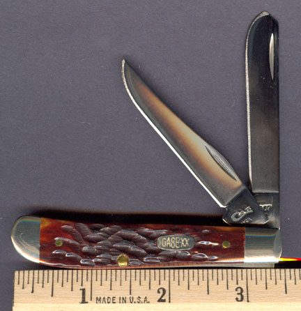 CA-27 The very popular 3 1/2" Mini Trapper style with clip and spey blades. This knife has the popular Chestnut Bone Handle. Not only is this a scarce knife it is new in the original box with Case info insert and wrapped in the original brown paper. This knife is for the collector who wants the best mint condition knives they can find. Case made in the USA by American Craftsmen!
