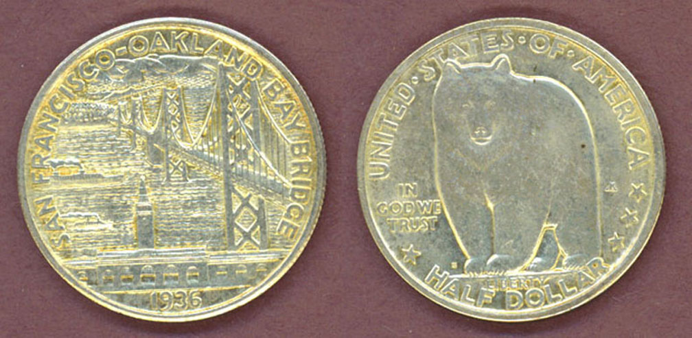 CHD-62 About Uncirculated+ San Francisco-Oakland Bay Bridge Half Dollar - Excellent luster with a few light hairlines. The opening of the San Francisco Bay Bridge was the occasion for this commemorative. The bridge is shown in great detail on the reverse with a California Grizzly bear on the obverse. Mintage of only 71,424