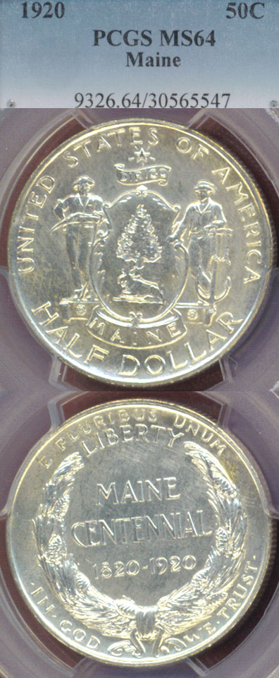 Item Number: CHD-148 PCGS MS64 - Maine Centennial Half Dollar- Great luster and clean surfaces on this Low minted example with only 50,028 made. The arms of the state of Maine appears on the obverse.$225.00