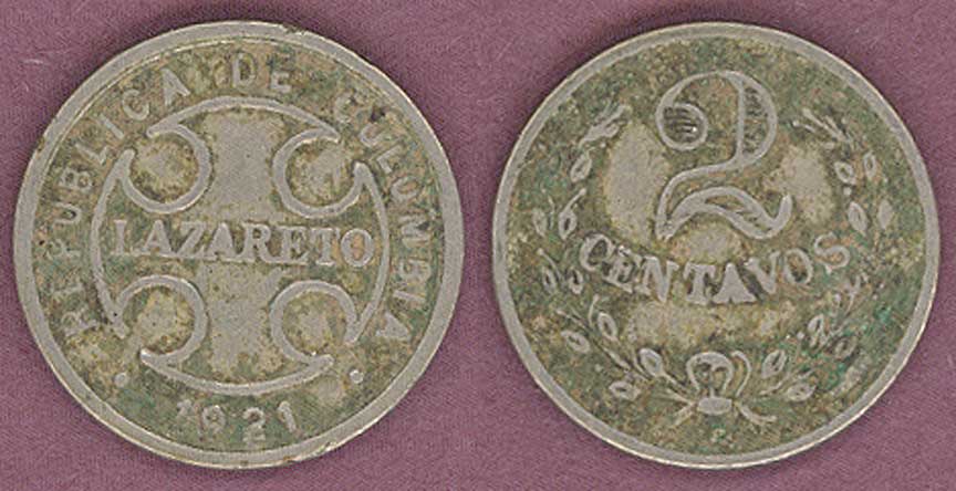 Item Number: COL-32 Fine+ - 2 Centavo KM#L10 Copper-Nickel - Special Leprosarium coinage - Made for the three leper colonies of Columbia. The colonies were closed in 1950. Made at the Bogota Mint.$10.00