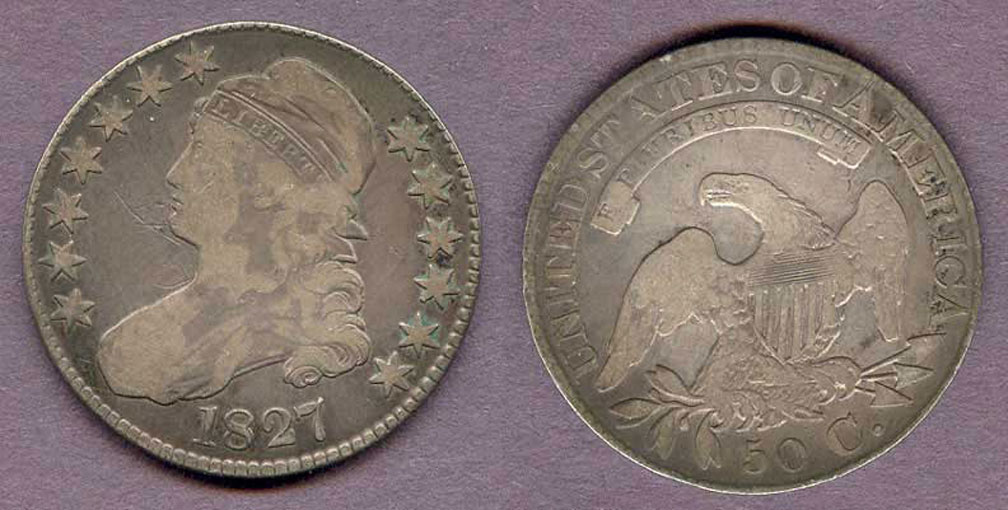 Item Number: EHD-42 Fine - Square Base 2 - Original uncleaned Capped Bust Half Dollar with small scratch in field on obverse. Mintage for all varieties 5,493,400$90.00
