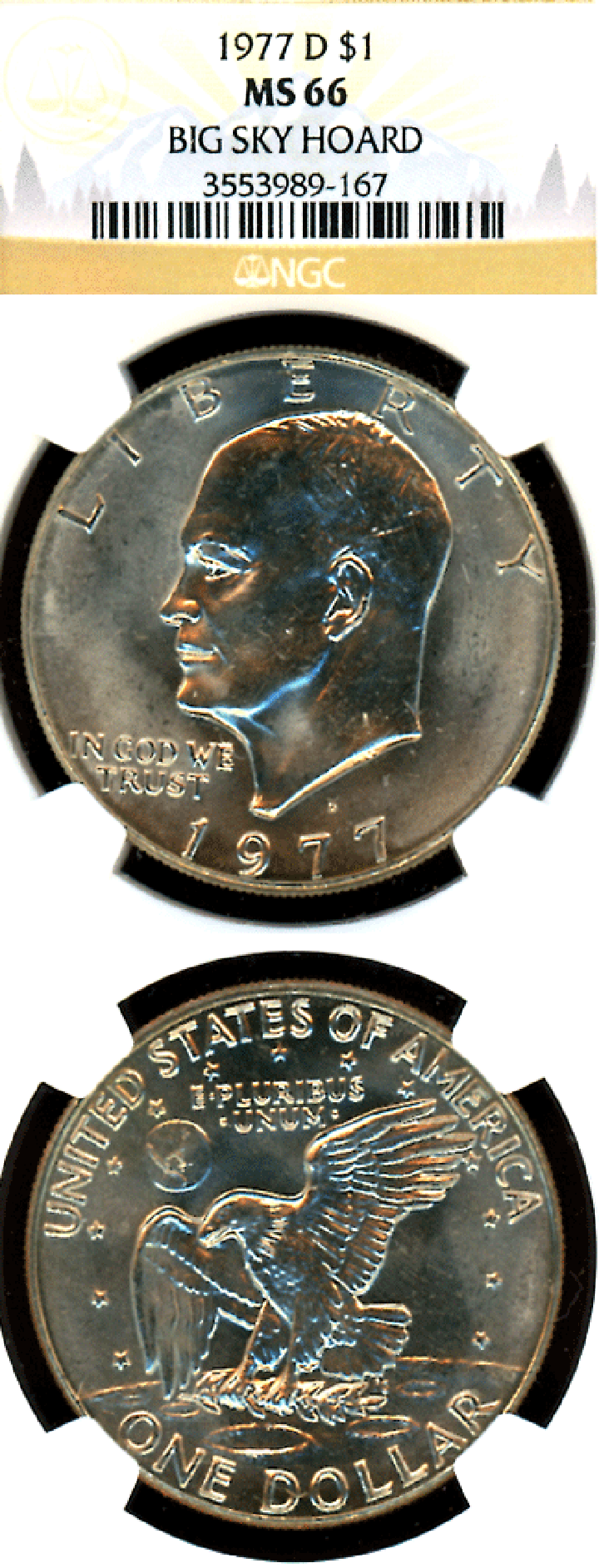 Item Number: IKE-124. NGC Mint State-66 Big Sky Hoard - High grade GEM+ Copper-Nickel Clad Ike dollar. From the Montana Big Sky Hoard$125.00