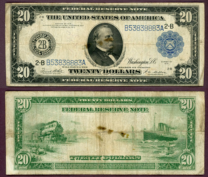 Item Number: LFRN-83 Fine - FR-971 From the New York District 2-B White/Mellon signatures. A few light stains on this Large size Federal Reserve note. Great transportation theme on back.$150.00