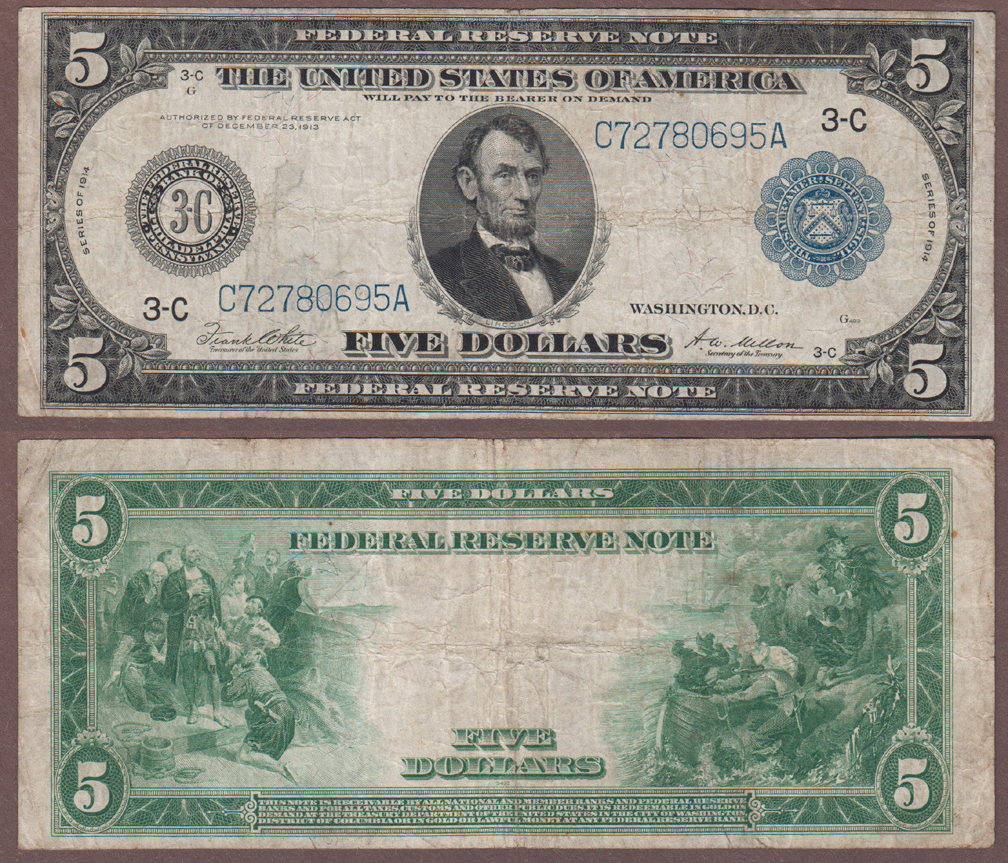 Item Number: LFRN-105 Fine - FR-855a Large Size Note from the Philadelphia District 3-C White/Mellon signatures. The back illustrations are Columbus in sight of land and the landing of the Pilgrims. $100.00
