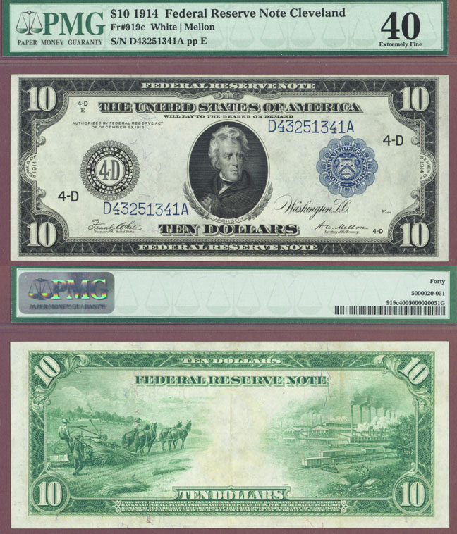 Item Number: LFRN-67 PMG Extremely Fine 40 - FR-919c Large Size Federal Reserve Note from the Cleveland District 4-D and the "c" variety. White/Mellon signatures. Very clean and bright for the grade. Popular Agriculture and Industry theme on the back.$375.00