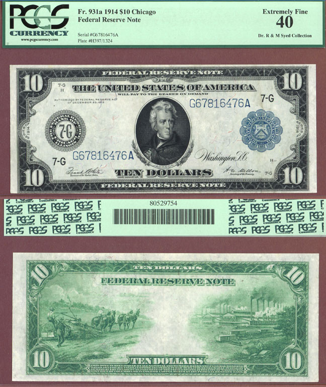 PMG Extremely Fine 40 - FR-931a Large Size Federal Reserve Note from the Chicago District 7-G and the "a" variety. White/Mellon signatures. Original bright note from the Dr. R&M Syed Collection. Popular Agriculture and Industry theme on the back.