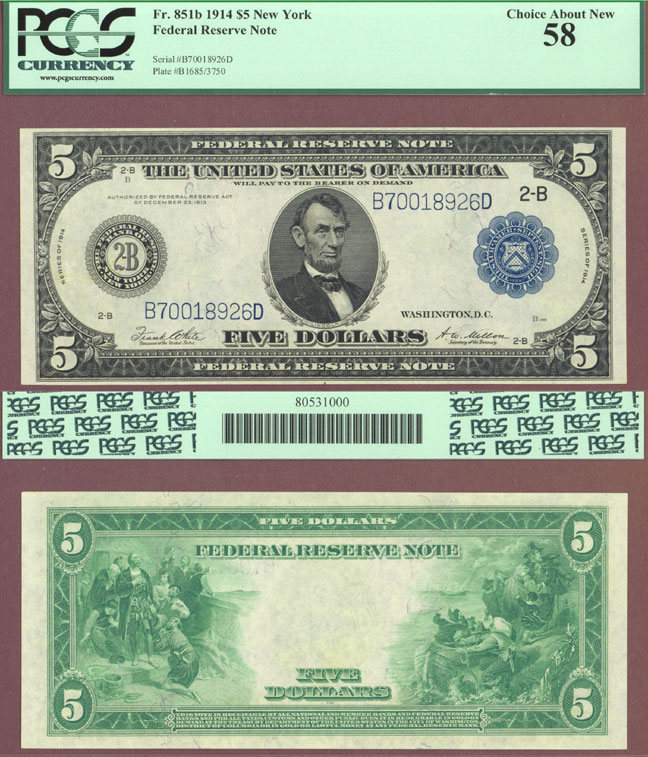 PMG Choice About Uncirculated 58 - FR-851b Large Size Note from the New York District 2-B White/Mellon signatures. Well centered on both sides with fresh clean surfaces. The back illustrations are Columbus in sight of land and the landing of the Pilgrims.