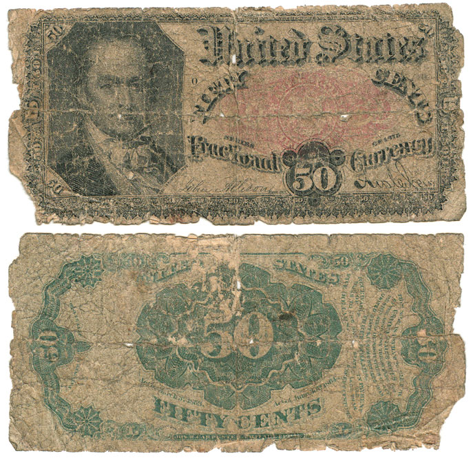 Item Number: FRAC-71 About Good - FR-1380 - Issued 2-26-1874 to 2-15-1876 - William H. Crawford, Secretary of both War and Treasury Departments 1815-1825. A piece missing in lower left corner with tears.The last series for the fractional currency.$10.00