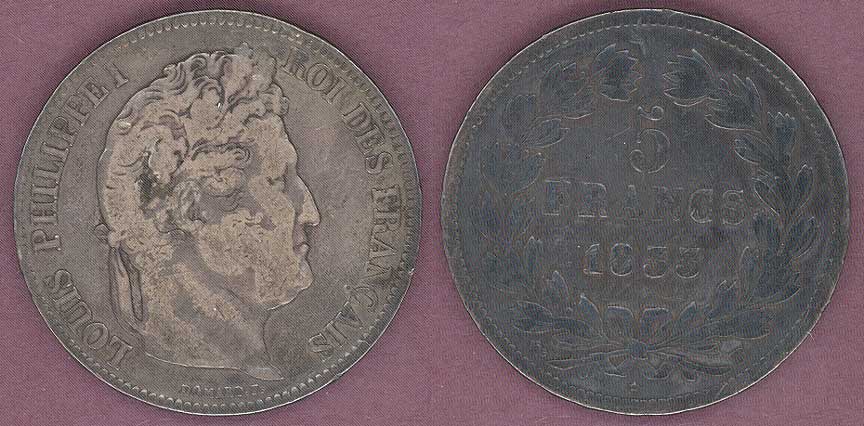 Item Number: F-45 Fine+ 5 Francs #749.12 .900 Silver Nantes Mint. Original uncleaned coin made at the Nantes mint for only 4 years. Large silver dollar size coin about 37 MM.$60.00