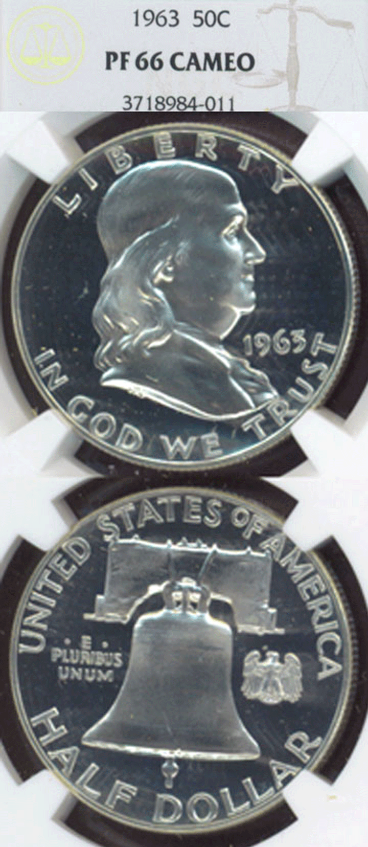 Item Number: FHD-170. NGC - PROOF 66 Cameo - Clean cameo devices against black mirrored fields. Last year for the Franklin Half dollar. $70.00