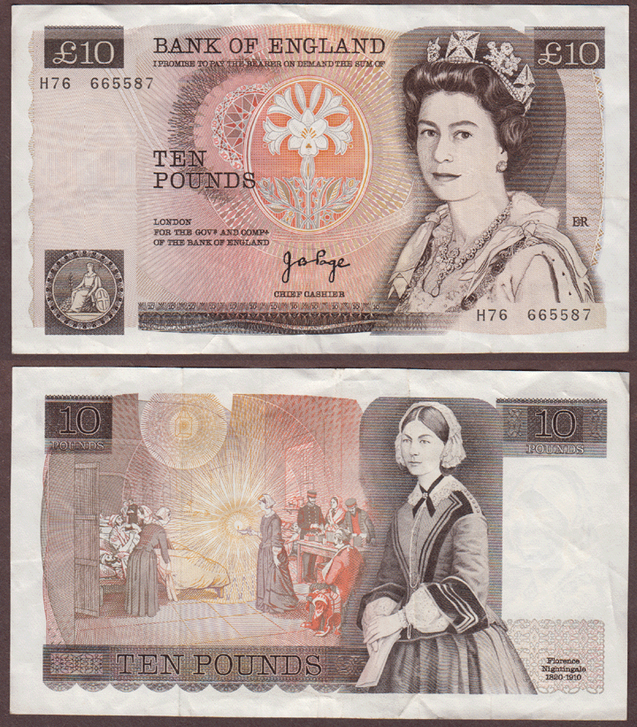 Very Fine - #379 No Date Bank of England 10 Pound note. Deep brown on multicolored underprint, with Portrait of Queen Elizabeth II in court robes on right. Florence Nightingale at center right with hospital scene at center on back. Watermark: Florence Nightingale