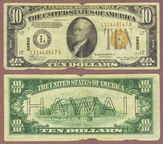 Item Number: Hawaii-40 Very Good/Fine - Emergency currency issue for Pearl Harbor after the attack by Japan. Some pieces missing along the edges. Julian/Morgenthau FR-2303$65.00