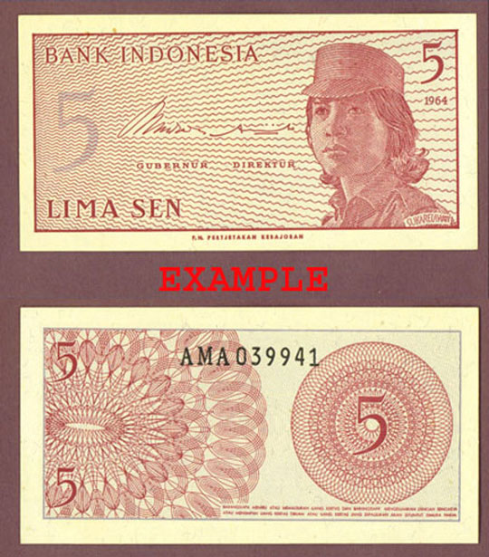 Item Number: INDO-24E Crisp Uncirculated - #91 Small size note 4" X 2" Front is Lilac-brown with female volunteer in uniform at right. Back is same color with serial #.$1.00