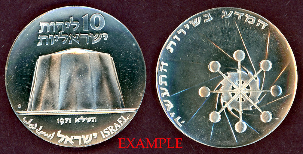 Item Number: IS-27E Uncirculated -10 Lirot #58 37 MM .900 Silver - 23rd Anniversary of independence. Stylized atomic reactor on obverse. Reverse - Molecule, cog wheel. Lettered edge$50.00