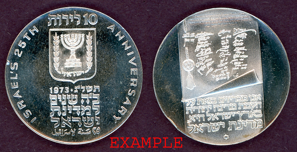 Item Number: IS-30E Uncirculated -10 Lirot #71 - 37 MM .900 Silver - 25th Anniversary of independence. Menorah flanked by sprigs. Reverse - Text on scroll. Lettered edge$50.00