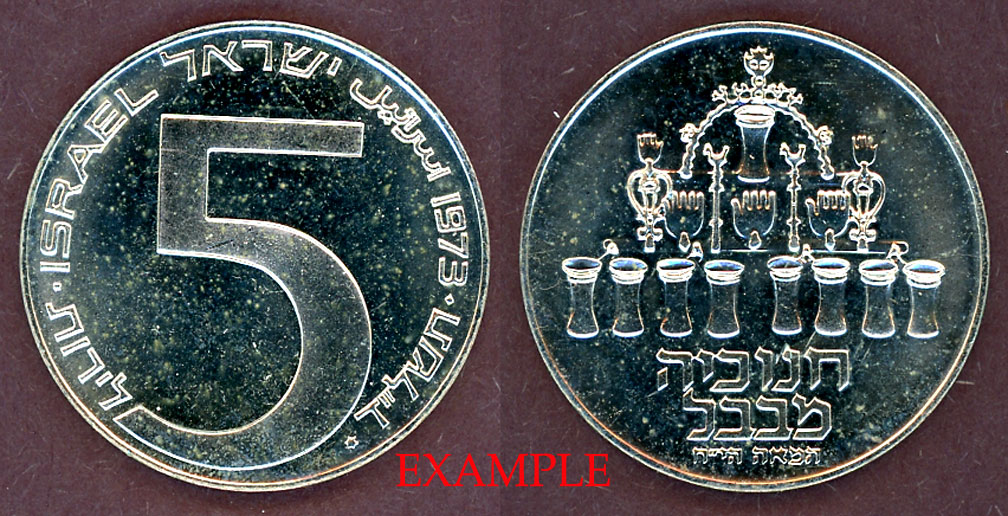 Item Number: IS-29E Uncirculated -5 Lirot #75.1 34 MM .500 Silver - Hanukka with Babylonian lamp on reverse. plain edge$25.00