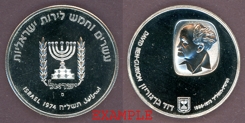 Item Number: IS-31E Uncirculated - 25 Lirot #79.1 37 MM .9350 Silver - 1st Anniversary of independence. Death of David Ben Gurion. Reverse - Menorah flanked by sprigs. Plain edge$55.00
