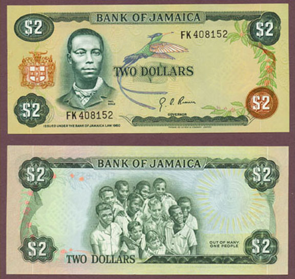 Item Number: J-24 Extremely Fine - #55 Front is dark green on multi-colored underprint with portrait of Paul Bogle on left and bird on center. Back is green with group of people. Beautiful pineapple watermark$6.00