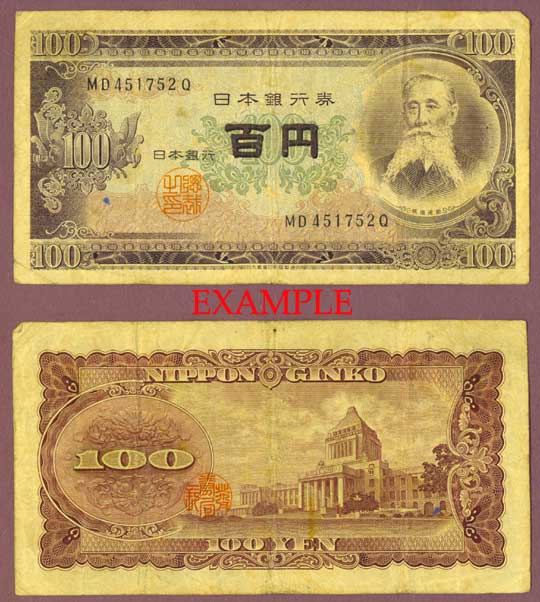 Item Number: JAP-34E Very Good or Better - #90 ND (1953) Brown-violet on green and multicolored underprint. Portrait of Itagaki Taisuke at right. Diet building on back.$4.00
