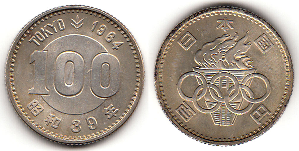 Item Number: JAP-40 Choice About Uncirculated - 100 Yen #79 .600 Silver Approximately 22.5 MM - 1964 Olympic Games. Olympic rings and torch. Numeral 100 within circle.$30.00