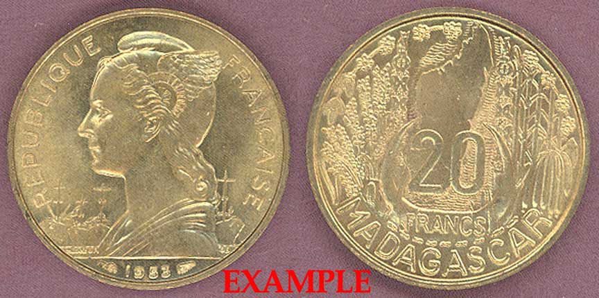 Item Number: MAD-25E Uncirculated - 20 Francs KM-7 Aluminum-Bronze Bust of Liberty. One year Type coin. Approximately 24 MM$10.00