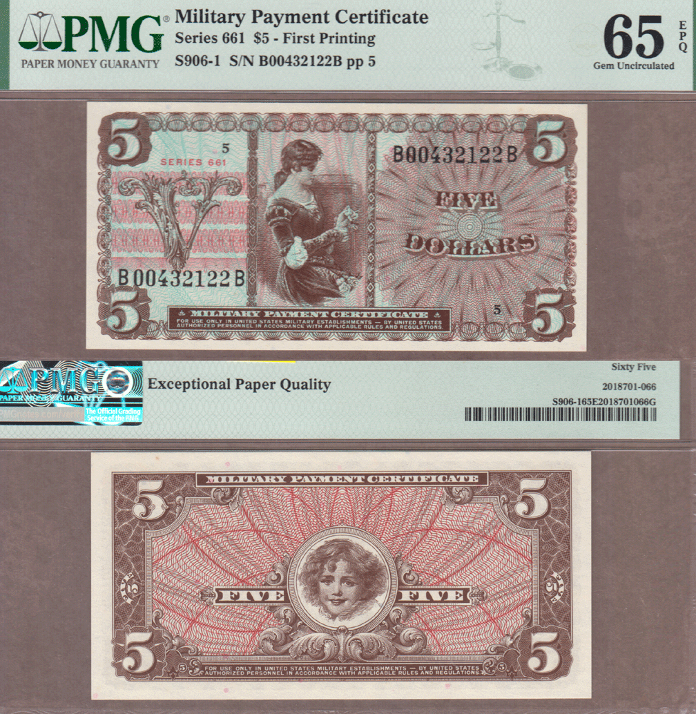 Item Number: MPC-292 PMG GEM Uncirculated 65 EPQ - Issued 10-21-68 to 8-11-69 - GEM quality note with great color, margins and fresh clean paper "EPQ". Front is multicolored brown, pink, purple and green with female at center. Back is brown and red.$95.00