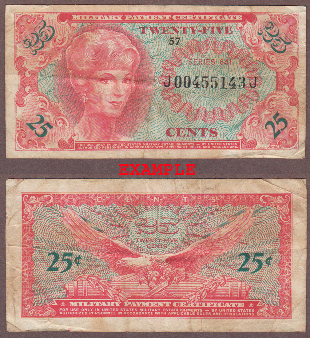 Item Number: MPC-233E Fine or Better - Used in Vietnam Issued 8-31-65 Withdrawn 10-21-68 - Front is red and green with blue 25's. Back is red and blue.$8.00