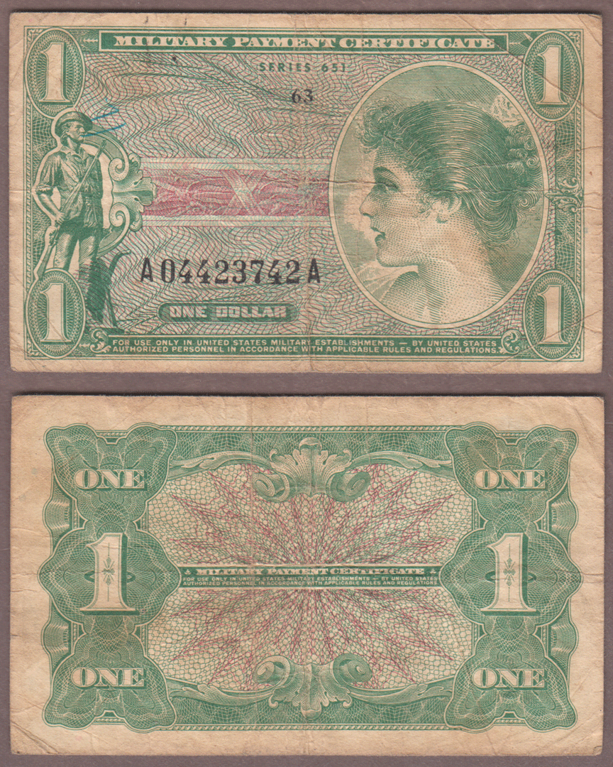 Item Number: MPC-214 Fine - Issued 4/28/69 to 11/19/73 Green with reddish underprint face of women at right - Minuteman at left. $20.00