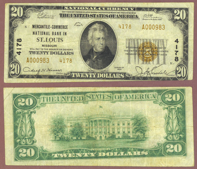 Item Number: SNBN-46 Fine/Very Fine - FR-1802-2 Mercantile-Commerce National Bank in St.Louis - Charter 4178. Margins are a little off center. Three digit serial number.$110.00