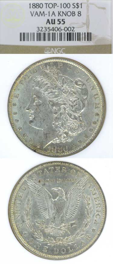 MD-1007 NGC About Uncirculated 55 - This is a Top-100 Vam 1A - Large major die break! Knob at top right of first 8 with crack continuing up into hair and neck. Scarce in all grades with only a few uncirculated example certified. Abundant luster on this original unmolested example.