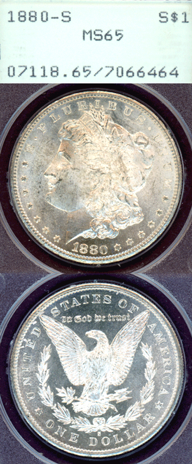 Item Number: MD-1514 PCGS MS-65 - Well struck San Francisco Mint GEM Morgan dollar in early flat rattler holder.$225.00