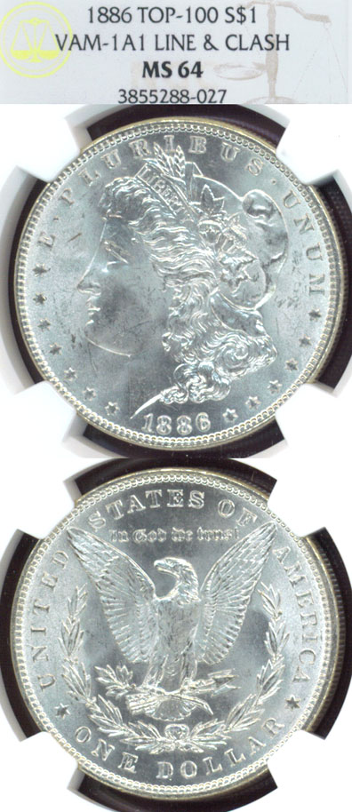 Item Number: MD-1351 NGC MS 64 - VAM 1A1 - Line in 6 & Clash - TOP 100 VAM - Rarity 5 - White well struck coin with radiant luster. $175.00