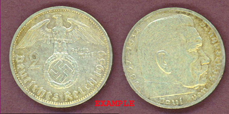 Item Number: Ger-40E Fine or Better - #93 2 Mark .625 Silver Various Mints Eagle on Swastika and Hindenburg. Made 1936 thru 1939.$15.00