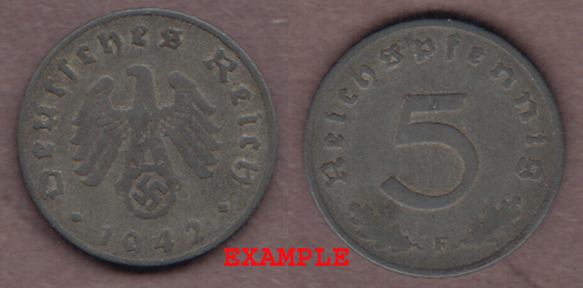 Very Good or Better - #100 - 5 Reichspfenning Zinc - Various Mints with Eagle on Swastika. About the size of a US dime.